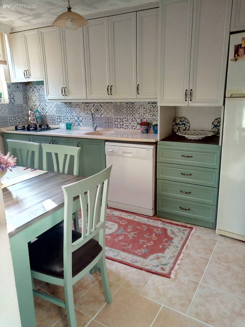 Mutfak ve salonun iç içe olduğu evde öncelikle uyumlu bir renk paletine başvurulmuş. Renklerden çok sevilen turuncunun mutlaka var olacağı bir palet seçilmiş.