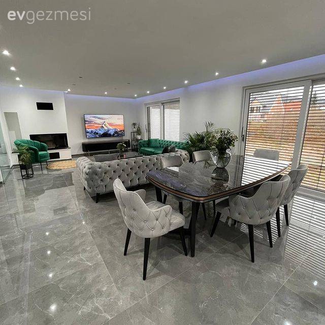 Salon için seçilen koltuklar hem görüntülerine hem de fonksiyonlarına göre seçilmiş. Yerden yüksek olan bu parçalar temizlik anında kolaylık sağlamış.