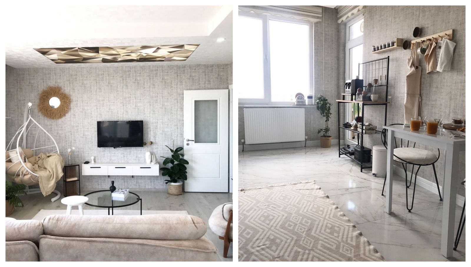 Tarz olarak modern boho şekilde deore edilen salonda, natürel bir renk paleti tercih edilmiş: Bej, beyaz ve kum renginin ferahlığı hasırlardan yayılan sıcaklıkla karıştırılmış.