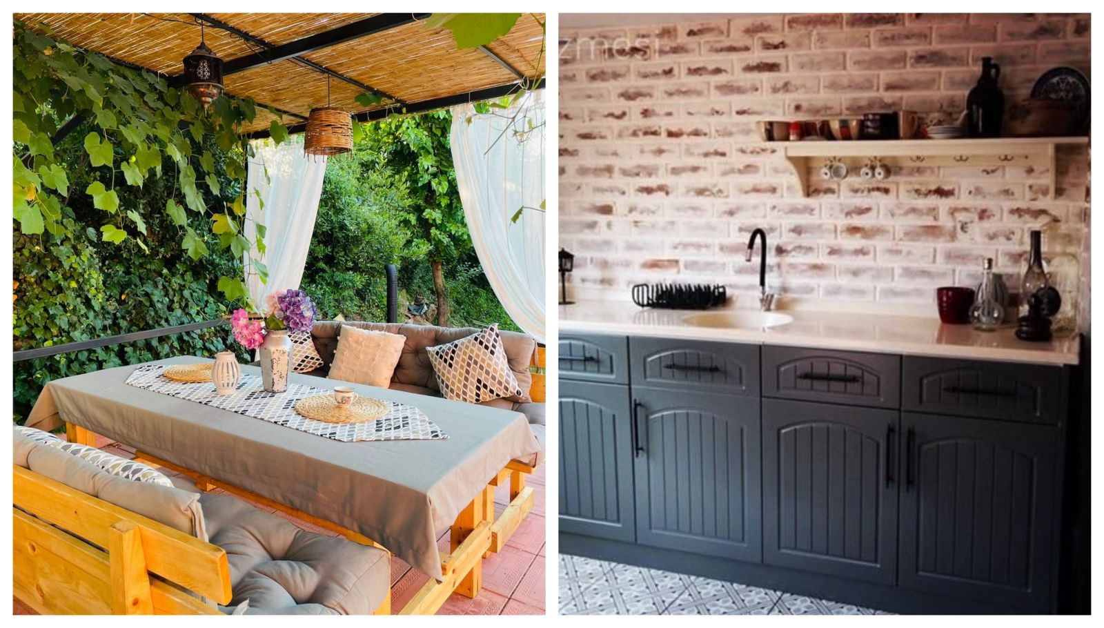Zamanın çoğu bahçede geçtiği için bahçeyi en keyifli hale getirmiş: Çardak üstüne hasır çitler yerleştirilmiş. KonforlU parçalar da oturma ihtiyacına yanıt vermiş.