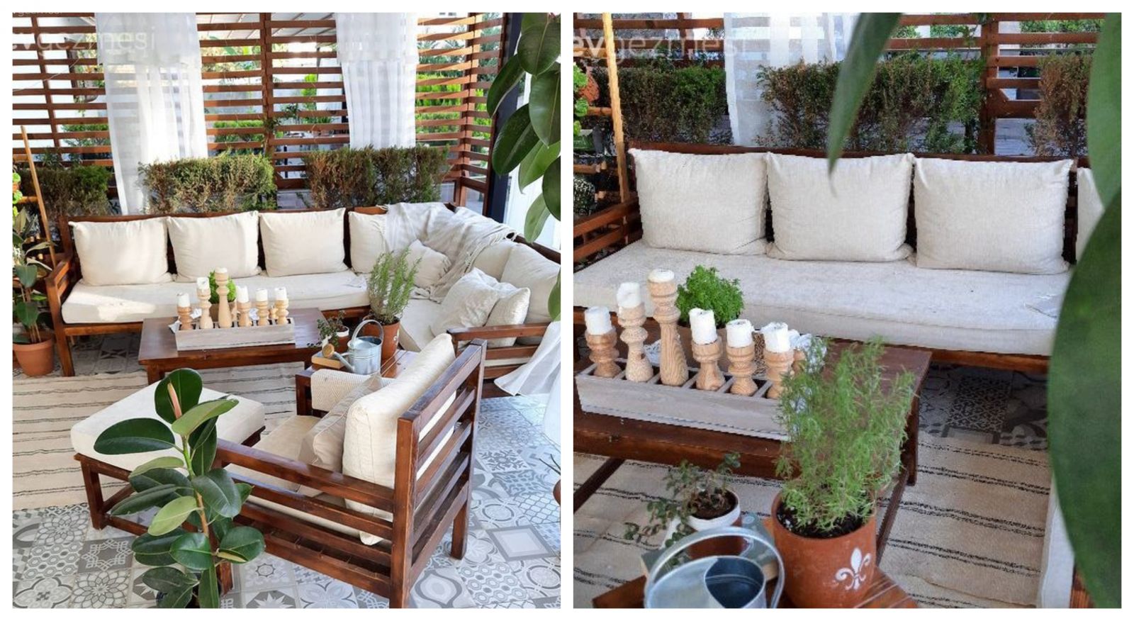 Ahşap bahçe mobilyaları üzerine eklenen beyaz minder ve kırlentlerle alandaki ferahlık seviyesi artmış. Bitkilerden yayılan yeşil de eklenince doğallık pekişmiş de pekişmiş.