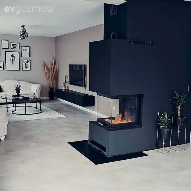 Gri ve beyazın uyumlu halini pirinç detaylarla tamamlayan mimarımız, bu sayede hem modern sesi yükseltmiş hem de alana hareket katmış.
