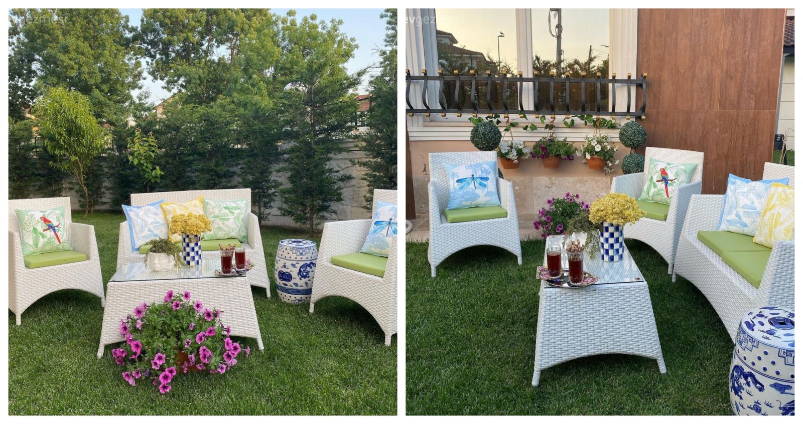 Rengarenk çiçekler ve blue blanc desenli objeler de bahçedeki yerini almış. Sonucunda da eğlenceli muhabbetlerin döneceği bir dekor ortaya çıkmış.