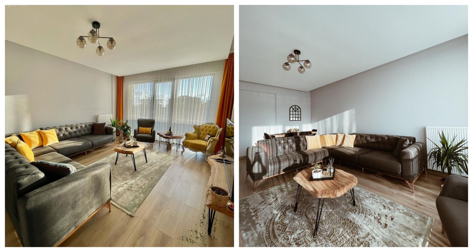 Dekorun son dokunuşları için rustik avize, renkli perdeler ve olmaza olmaz bitkiler devreye girmiş. Hepsinin sonucunda da ev sahibinin istediği sıcaklıkta bir salon oluşmuş.