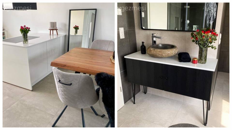 Tarz olarak modern stilin baskın olduğu evde, rustik dokunuşlar da kendine yer bulmuş. Modern stile göz kırpan mobilyalar, sıcaklık sağlayan detaylarla buluşturulmuş.