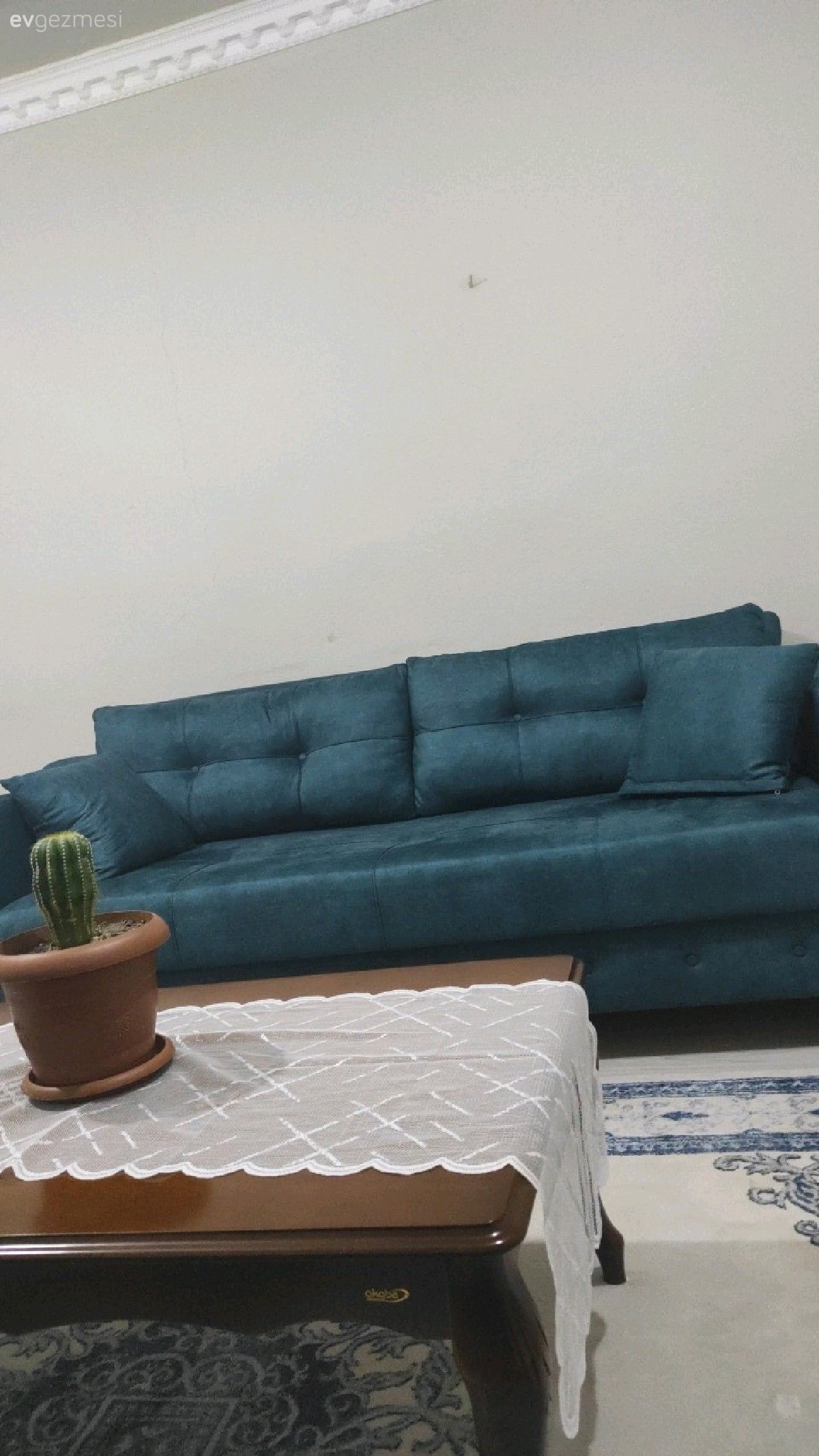 Konforlu bir koltuk takımını salon için seçen Ayfer Hanım, burada farklı hatların kontrastına yer vemiş: Bir yandan oval hatlar diğer yandan da keskin çizgiler alanda dikkat çekici bir hal oluşturmuş.