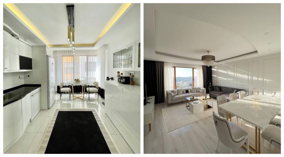 Beyaz ve ahşabın sıcacık buluşmasının sergilendiği mutfakta, beyaz geniş alanları kaplamış. Böylece ortamın ferahlık seviyesi artmış.