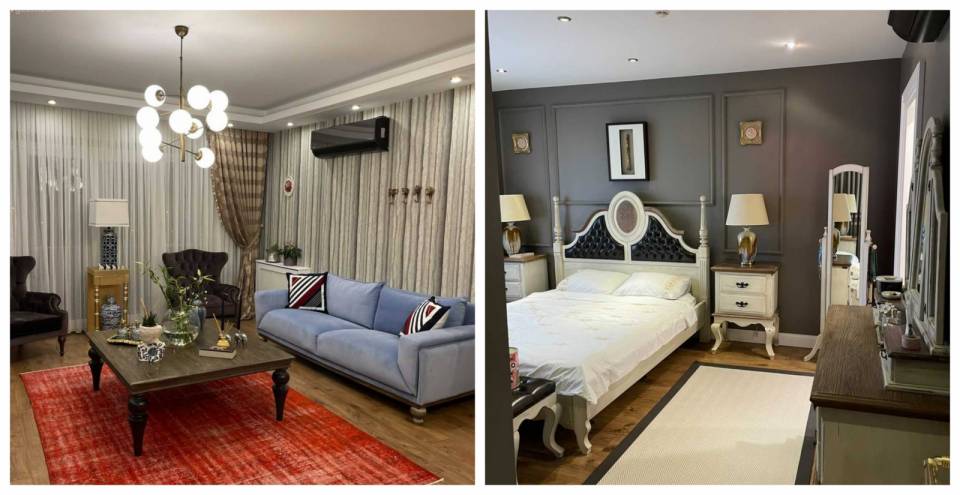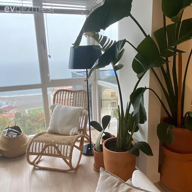 Evin genelinde aynı havayı sürdüren Nergiz Hanım, her odada büyük yapraklı bitkilerle sıcaklığı korumuş.