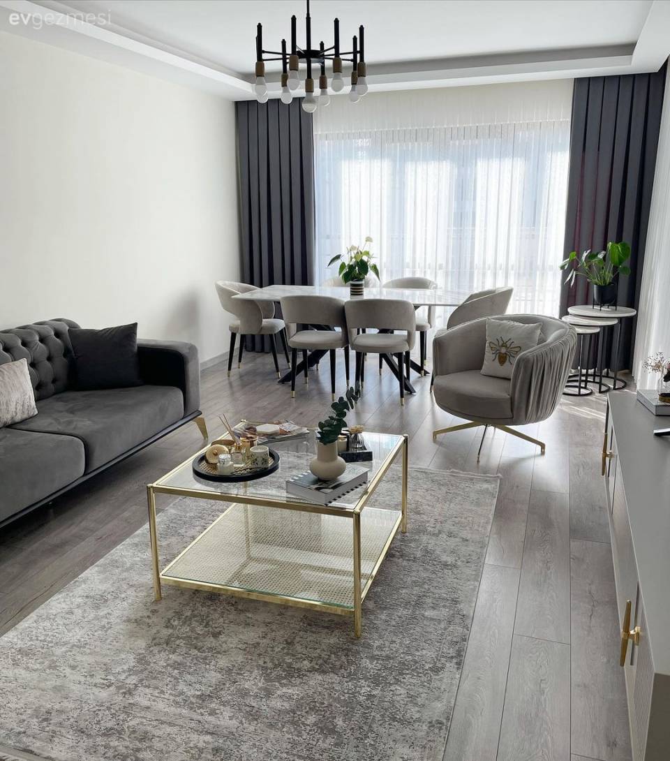 Salon, Rustik, Gri, Beyaz, Kahverengi, Koltuk takımı, Amerikan Mutfak, Mutfak, Tavan dekorasyon, Ayna, Avize, Aydınlatma, Orta sehpa, Sehpa, Halı, Parke, Kırlent, Ev tekstili
