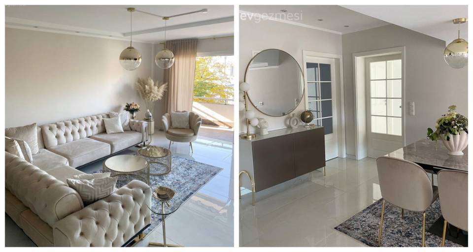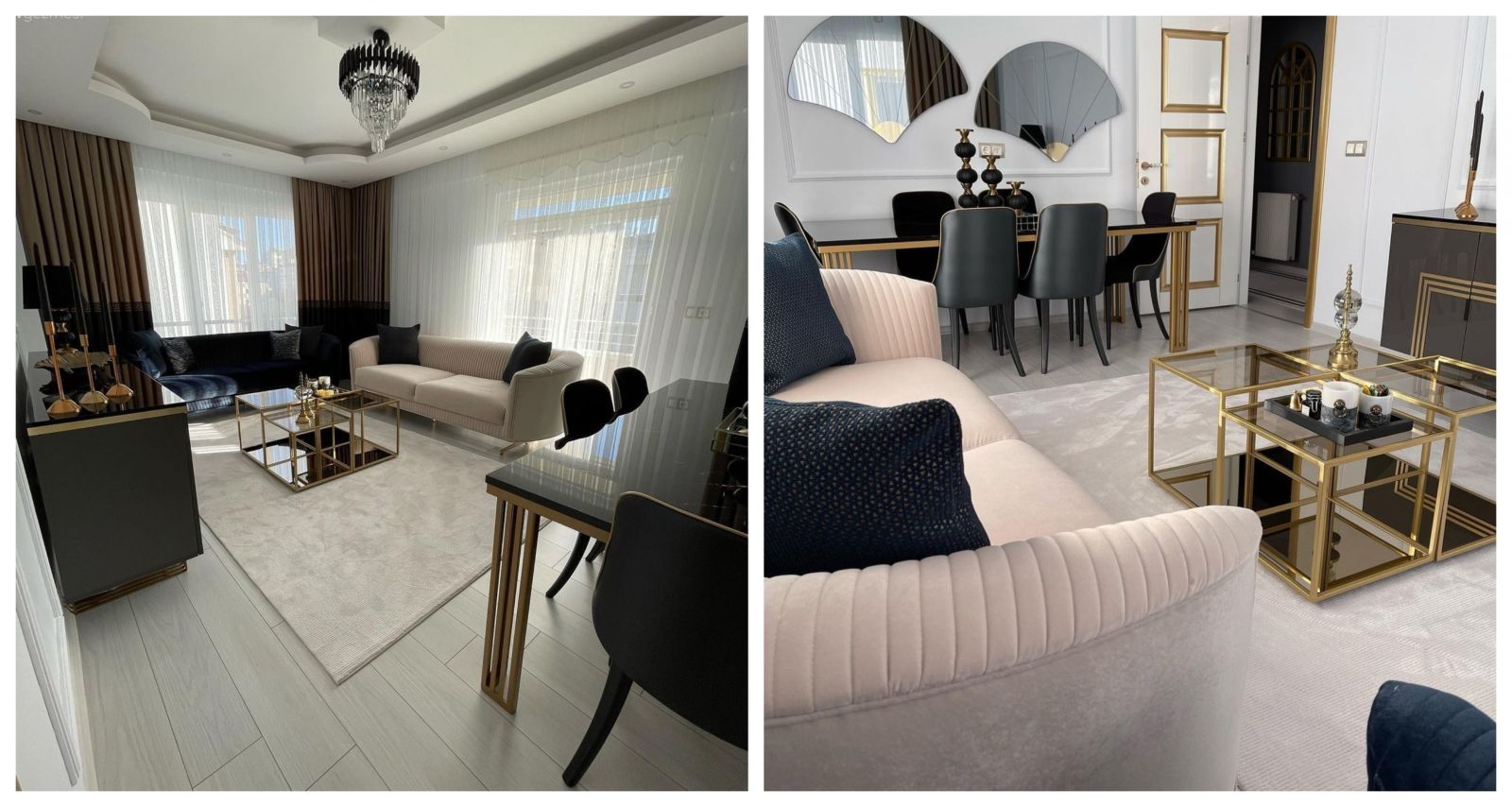 Salon, Art deko, Krem, Bej, Lacivert, Füme, Altın, Koltuk takımı, Kırlent, Ev tekstili, Orta sehpa, Sehpa, Ev Aksesuar, Sandalye, Yemek masası, Ayna, Duvar çıtalama, Konsol, Konsol üzeri dekoratif objeleri