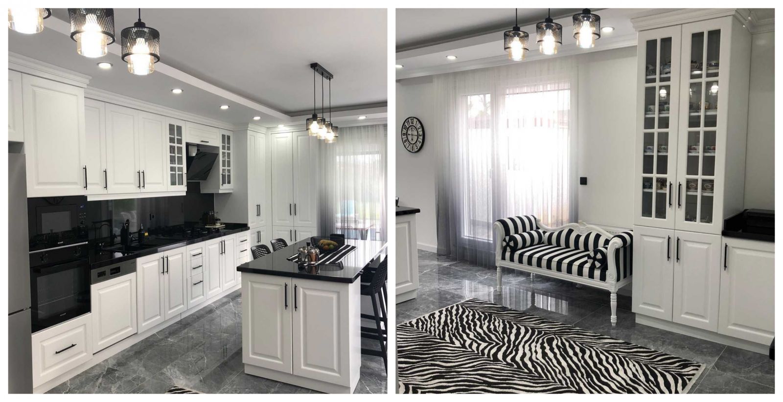 Mutfak, Beyaz, Siyah, Modern, Mutfak tezgah arası, Mutfak zemin seramikleri, Mutfak aksesuarları, Spot aydınlatma, Aydınlatma, Mutfak televizyonu, Siyah- Beyaz, Mutfak Avize Modelleri, Sandalye, Mutfak köşesi, Mutfak halısı