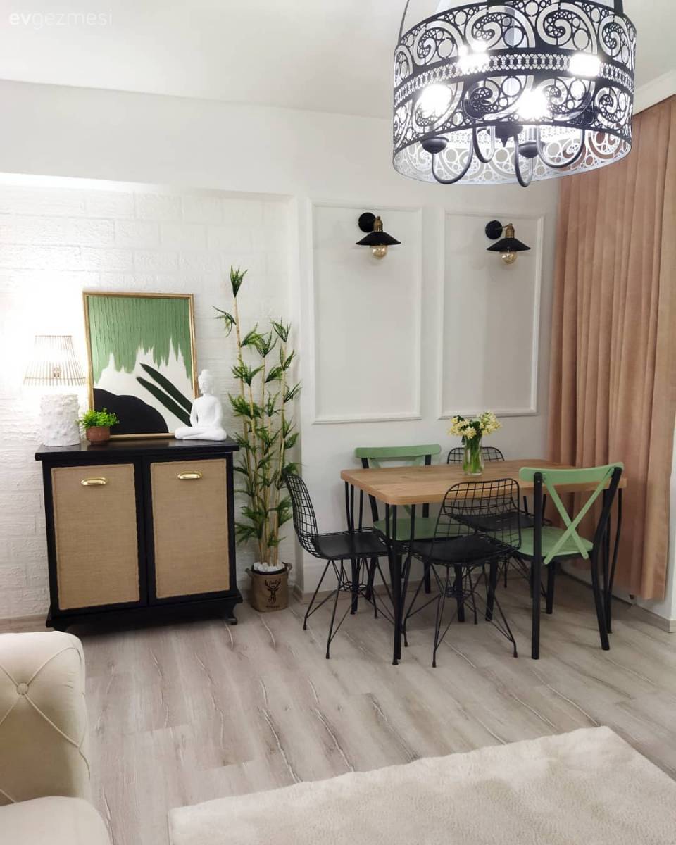 Ahşap parçalar, makromeler ve hasırlar da ortamdaki natürel ambiyansı pekiştirmek için yerini almış. Böylece sıkıcı halden uzak bir dekor oluşmuş.