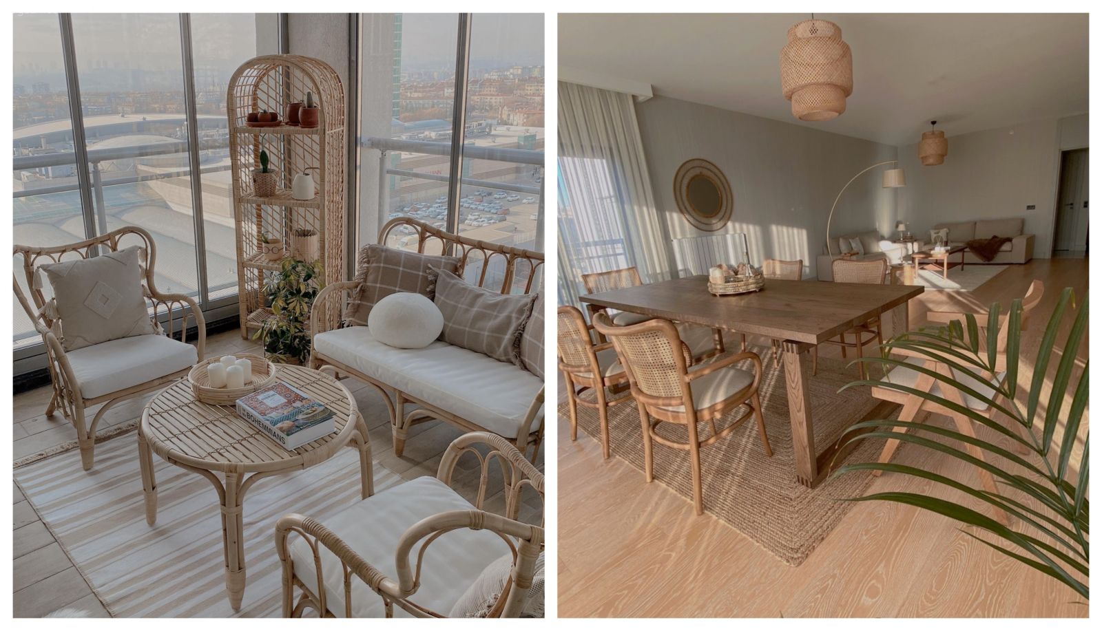Salon, Bohem Dekorasyon, İskandinav, Kahverengi, Krem, Koltuk takımı, Ahşap Mobilya, Halı, Salon halısı, Hasır avize, Avize, Aydınlatma, Lambader, Parke, Kırlent, Ev tekstili