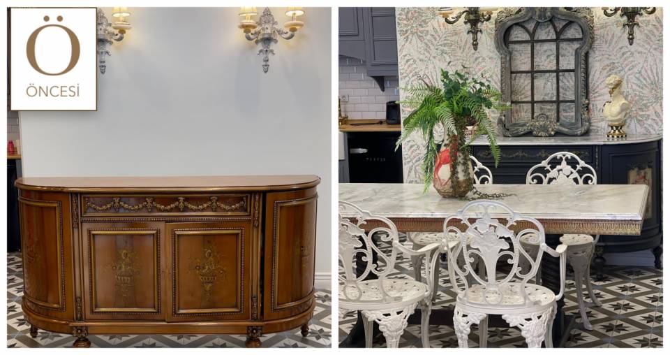 Eski halinde acı kahve olan büfe, beyaz ile boyanmış. Sonra da büfeye ayaklar takılmış. Büfenin eski halindeki cam bölmelere de bambu perdeden parçalar yerleştirilmiş.