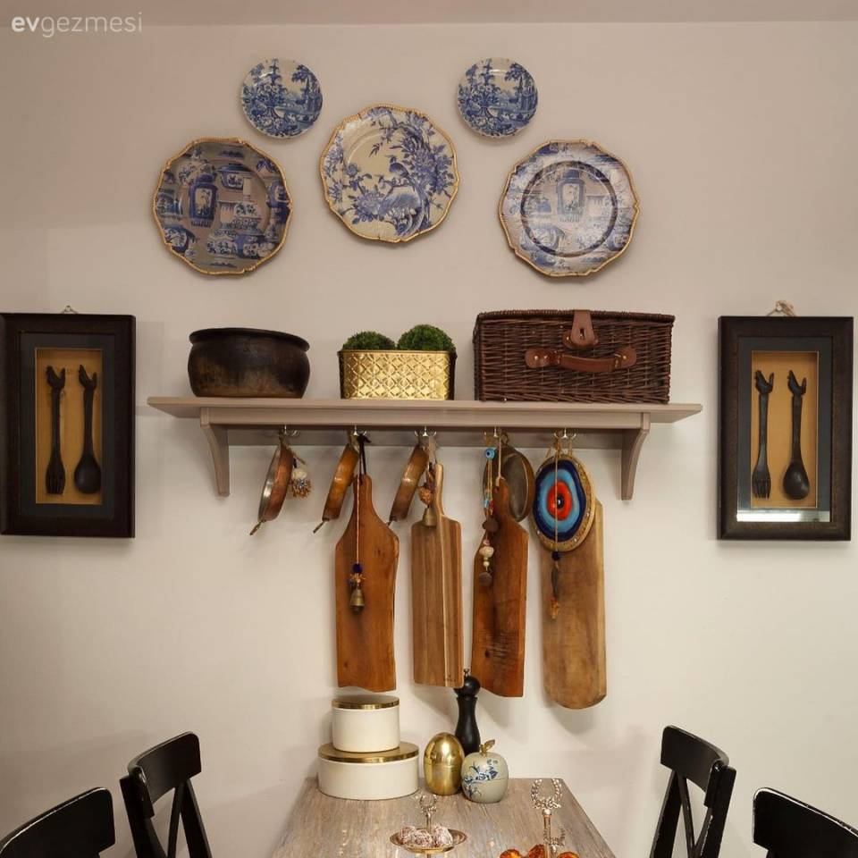 Mutfağın tamamlayıcı aksesuarlarında nakışlı bir runner kullanılmış. Dantel perde de bu otantik ruhu iyice beslemiş.