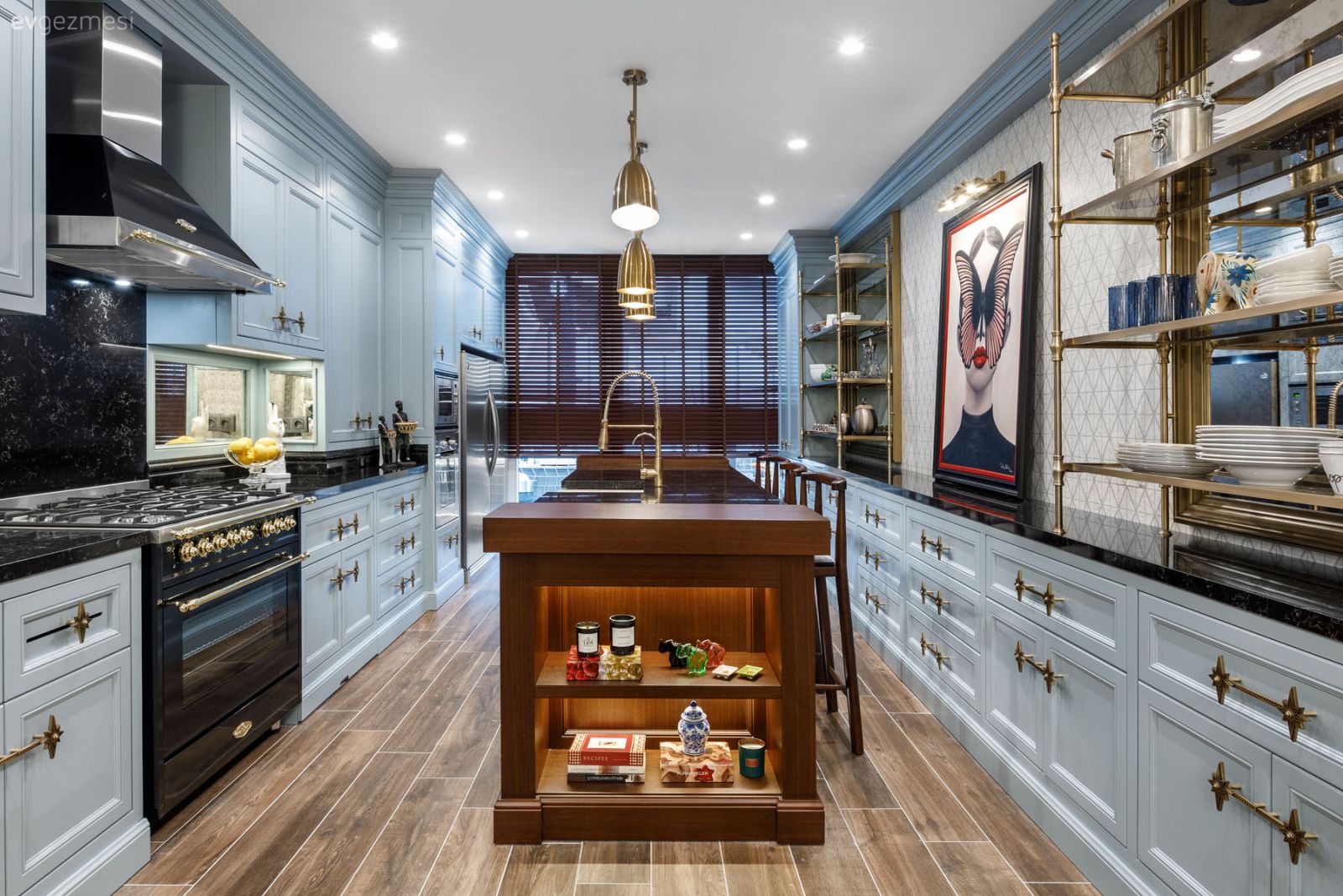 Sevgili Çağla Şıkel için, Yasmina İç Mimarlık Ofisi olarak kendisini daha mutlu hissedebileceği bir mutfak tasarladık. Alışılagelmiş dekorasyon çerçevesinin dışına çıkarak yenilikçi, modern ve şık çizgilerde daha kullanışlı bir mekan yarattık. Tasarımımızda vazgeçemediklerimizden olan pirinç detaylarına yer vermeye devam ettik. Mekanda baskınlık kurup diğer materyaller ile uyum sağlayabilecek; mavinin en güzel tonlarından birini kullandık ve bu tonu sizin mutfaklarınızda da trendler arasına taşıdık. Ada tezgah ve zeminde ahşabın sıcaklığıyla mekanı birbirine bağladık. Tüm bunlar dışında ev sahibimiz için değerli olan çocuklarına atıfta bulunduğumuz, özel imalatlarımız olan kuzey yıldızı kulplarımız ve uzayı yansıtan gezegenli aydınlatmalarımızla tasarımımızı kişisel kıldık. Yapımından oldukça zevk aldığımız keyifli projemizin detaylarını fotoğraflarımızdan inceleyebilirsiniz…
