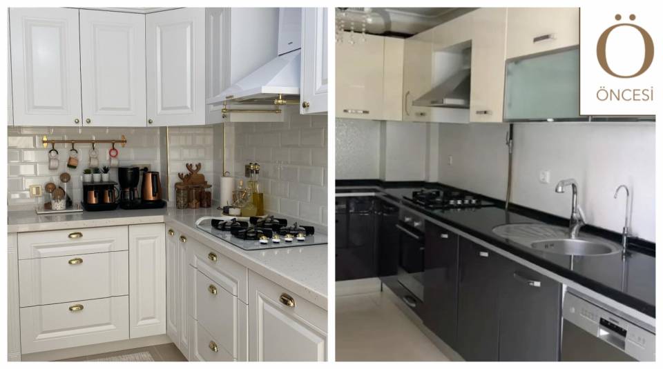 Mutfağın yeni halinde siyahın yerini tamamen beyaz almış. Alana yeni gelen renk ferahlık sağladığı gibi ev sahibi için temizliği de kolaylaştırmış. Çünkü siyah dolaplarla uğraşmak baya zormuş.