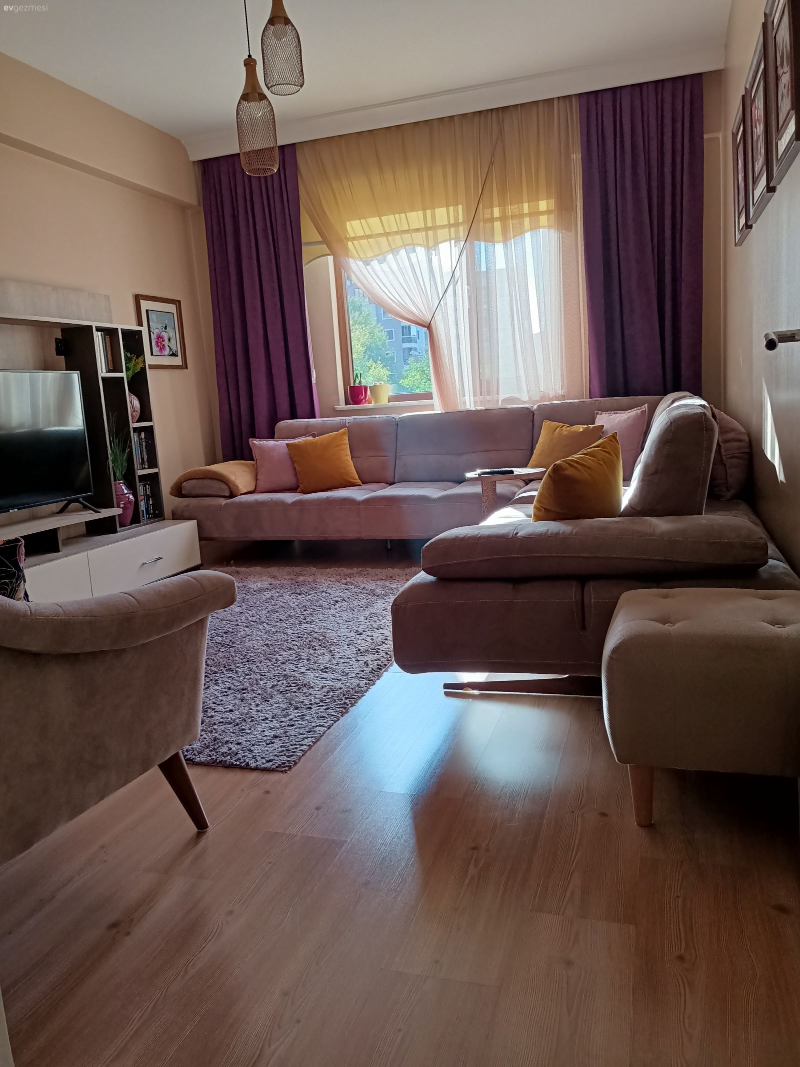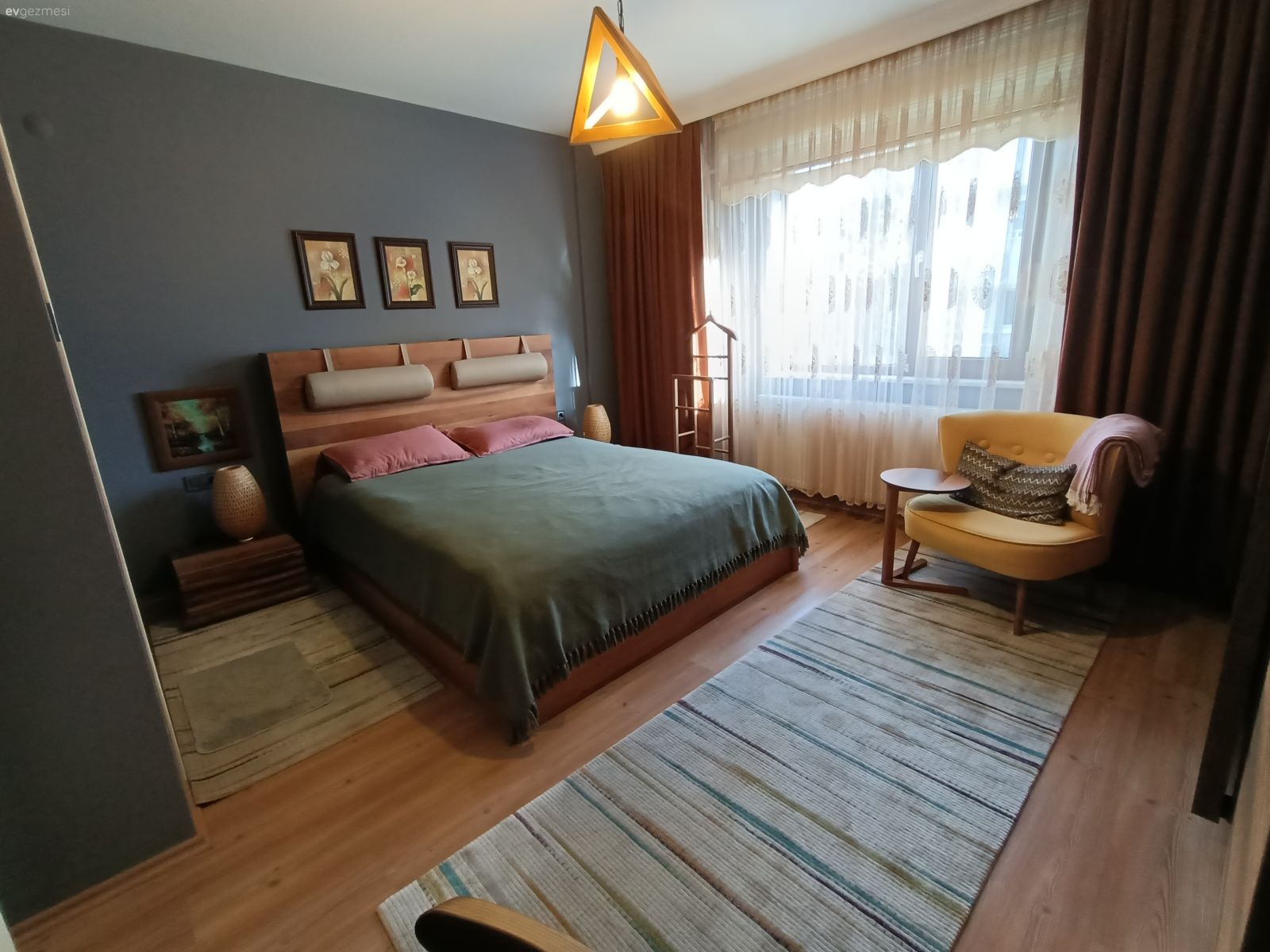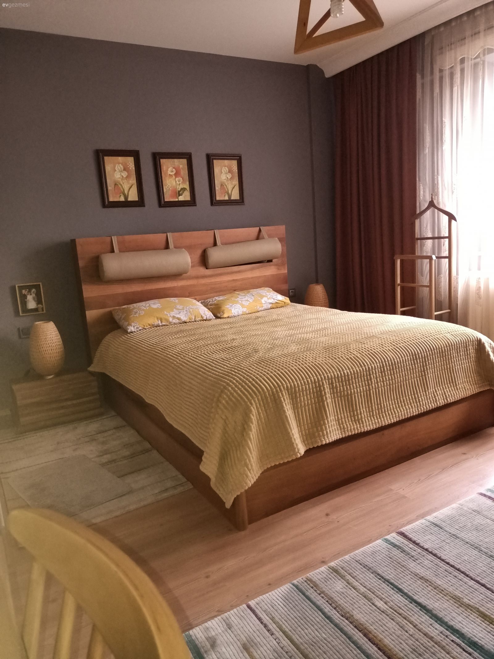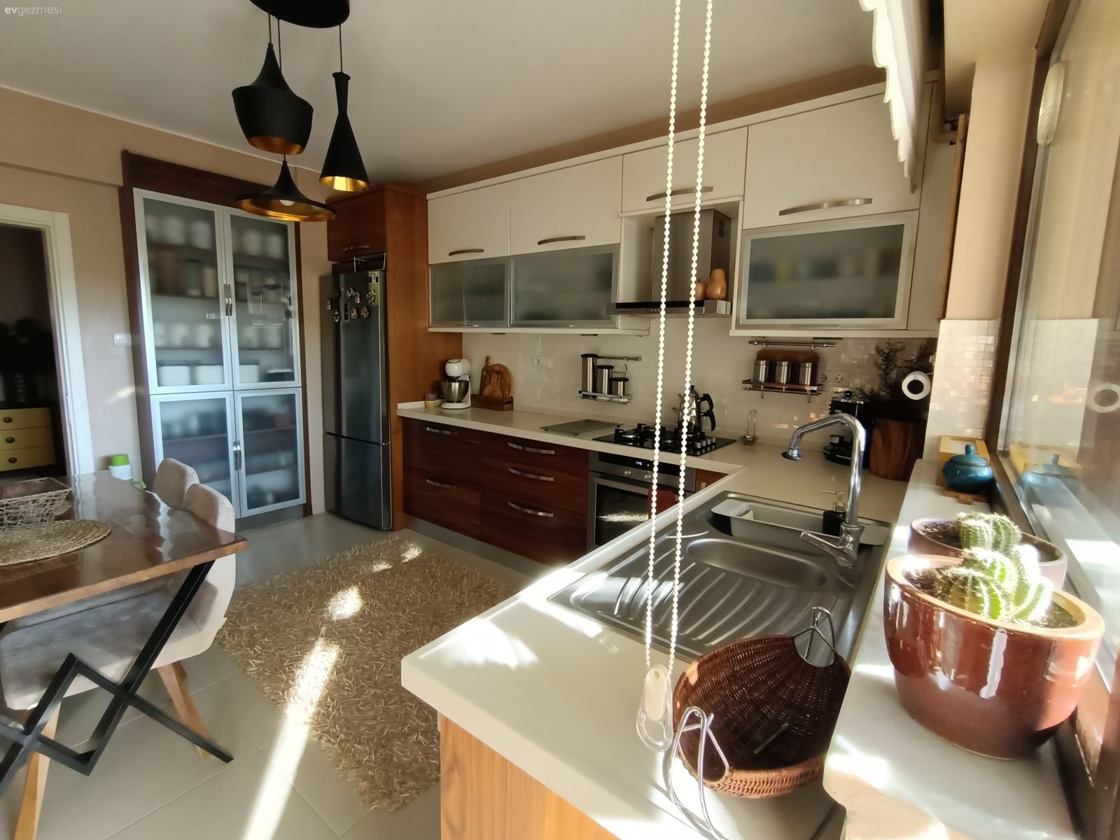 Her şeyin özenle seçildiği belli ve hepsi zevk sahibi biri tarafından seçildiği de belli. Yalnız ev çok karanlık geldi bana. Ev sabah güneşini görmeyen taraftadır galiba. Bu durumu az da olsun düzeltmek için perde renkleri biraz daha açık tercih edile bilirdi.