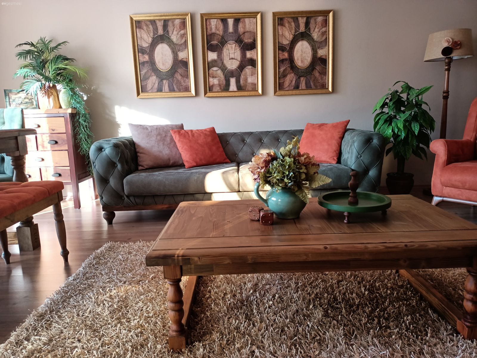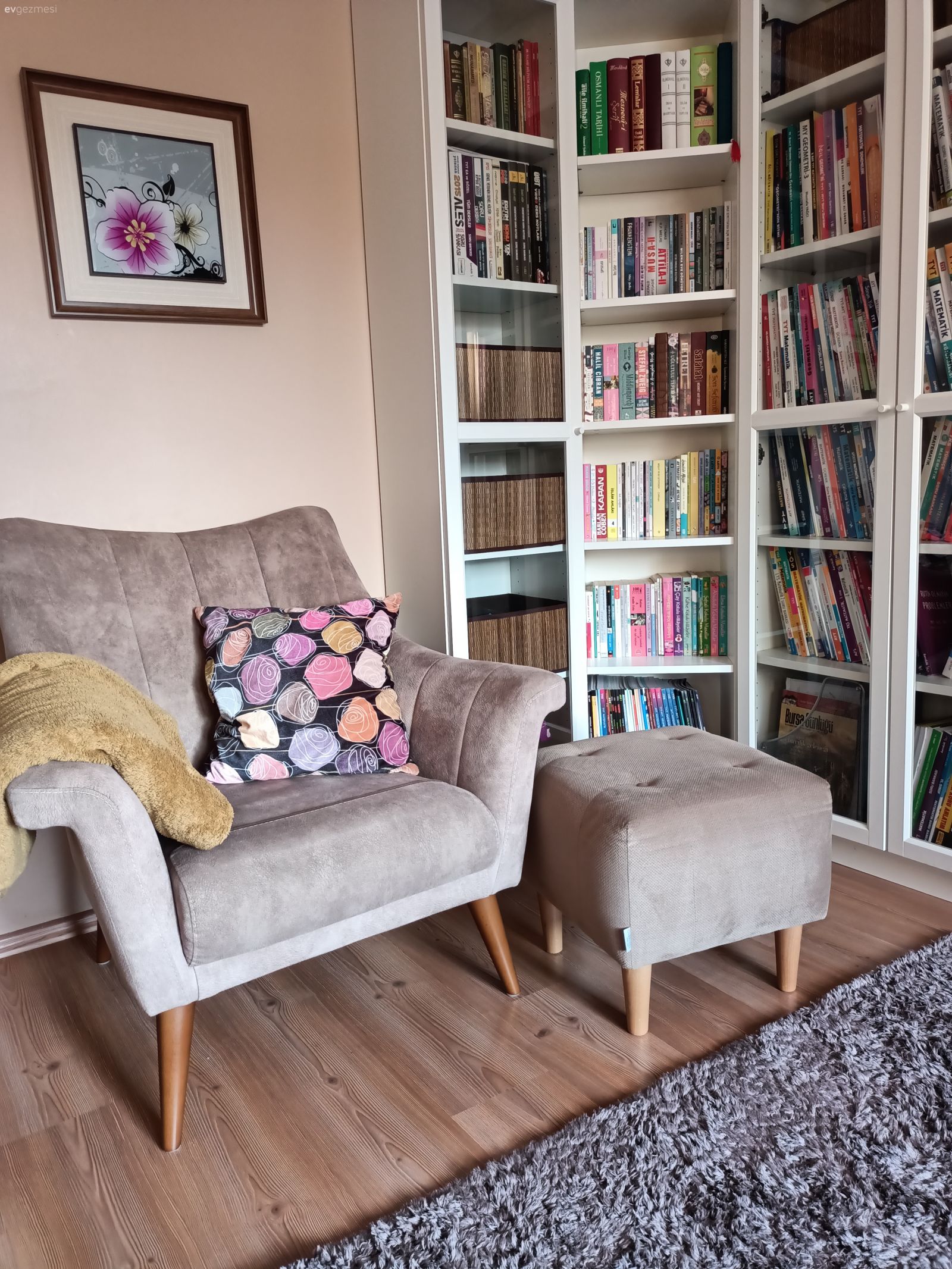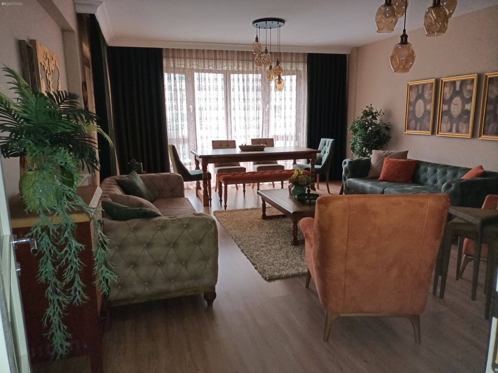 Her şeyin özenle seçildiği belli ve hepsi zevk sahibi biri tarafından seçildiği de belli. Yalnız ev çok karanlık geldi bana. Ev sabah güneşini görmeyen taraftadır galiba. Bu durumu az da olsun düzeltmek için perde renkleri biraz daha açık tercih edile bilirdi.