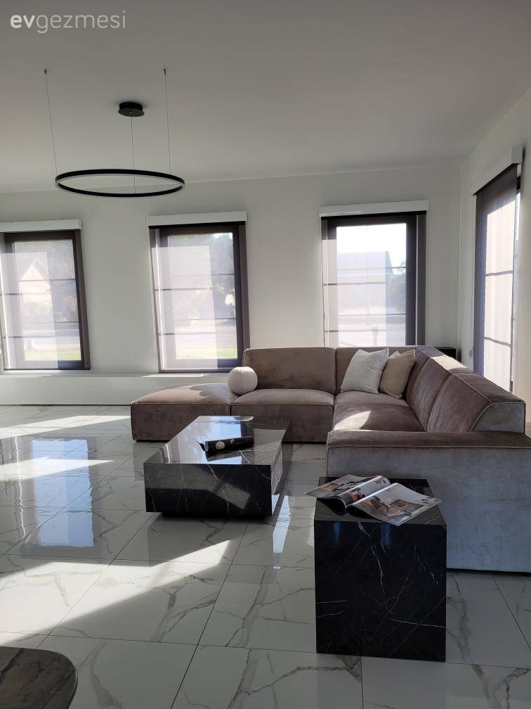 Modern stili yansıtan koltuk takımı konfor için görevi devralmış. Tamamlayıcı parçalar da rustik tarzı öne çıkarmış.