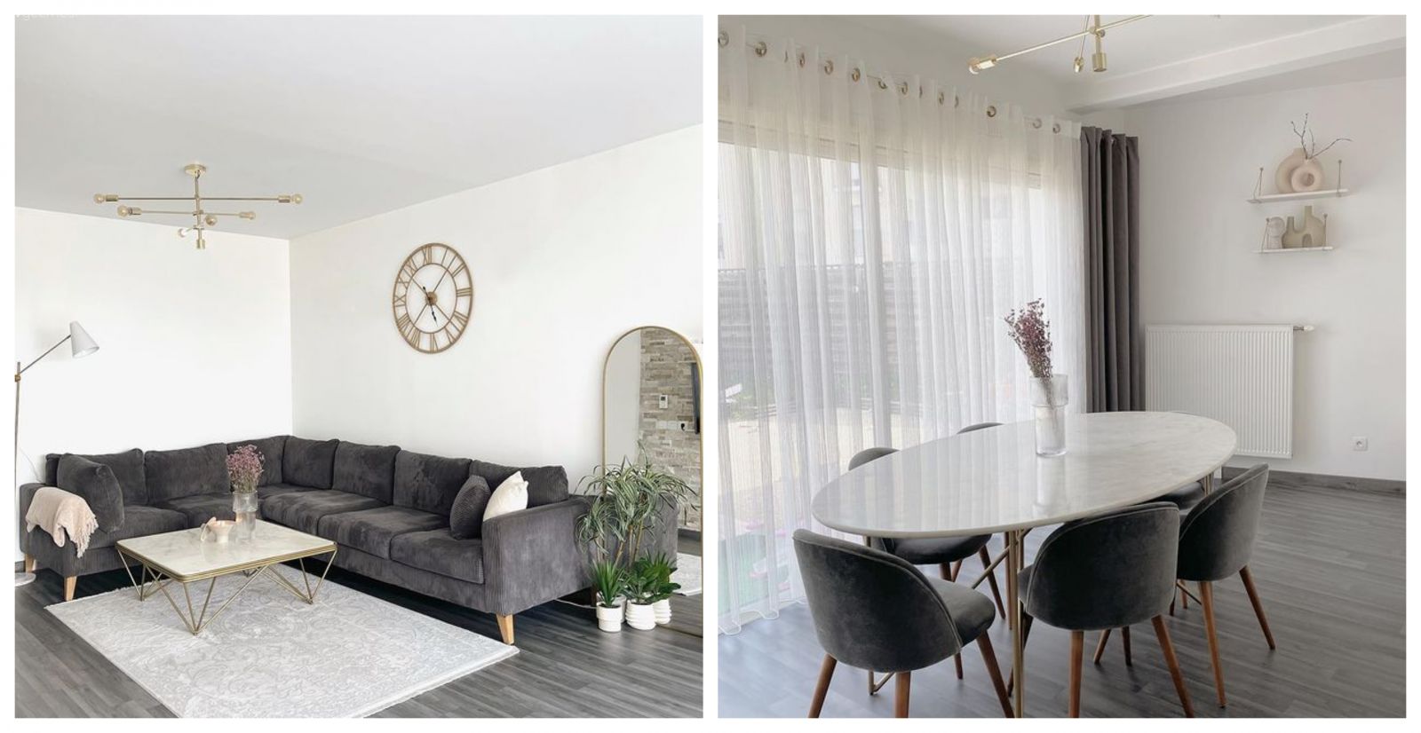 Altın, Duvar dekorasyonu, Metal duvar saati, Köşe koltuk, Koltuk takımı, Beyaz, Gri, Gri koltuk, Orta sehpa, Sehpa, Halı, Kırlent, Ev tekstili