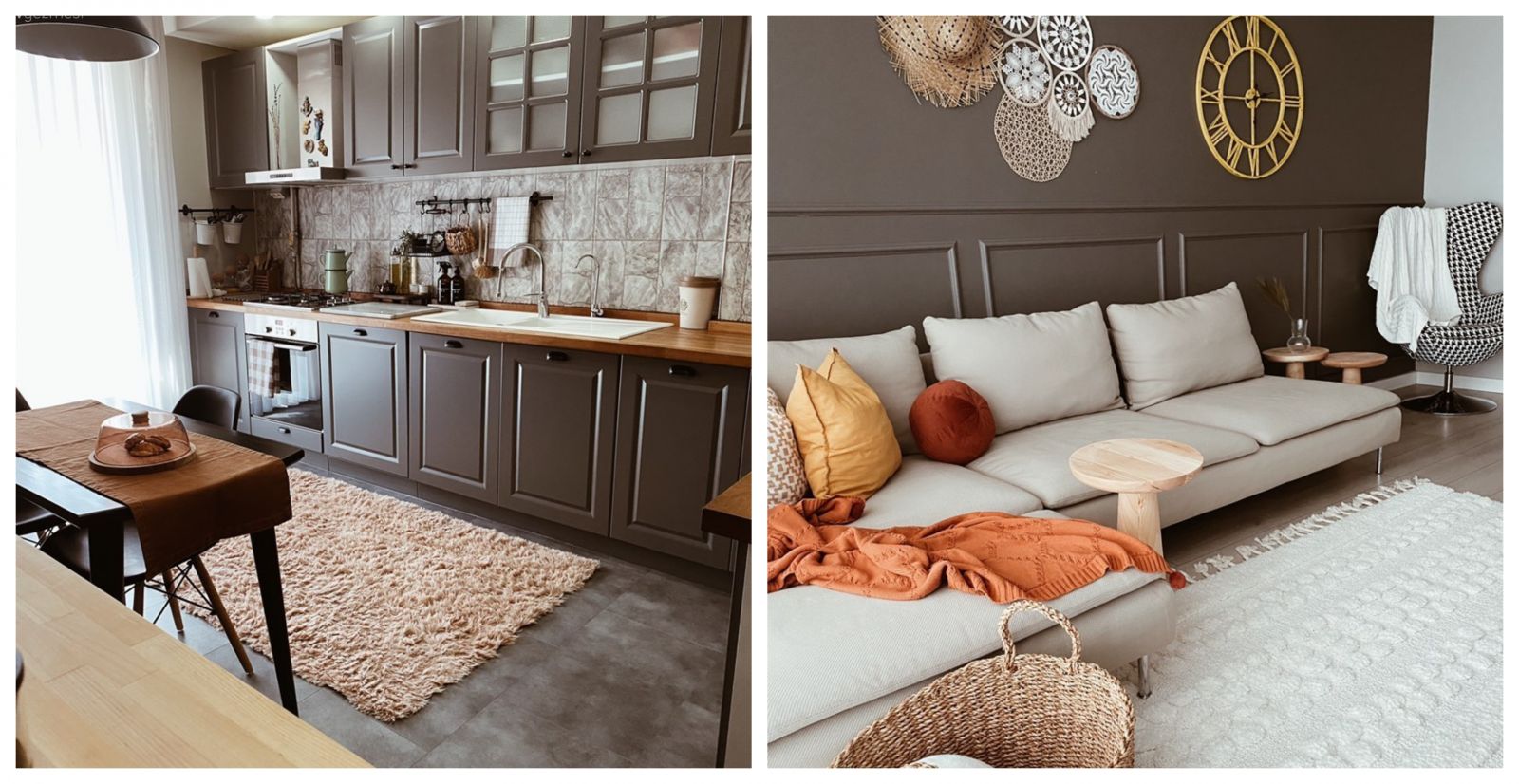 Salon, Modern, Bohem Dekorasyon, Gri duvar, Vizon, Koltuk takımı, Duvar çıtalama, Duvar dekorasyonu, Metal duvar saati, Kırlent, Ev tekstili, Hardal, Turuncu, Avize, Aydınlatma, Vazo, Ev Aksesuar