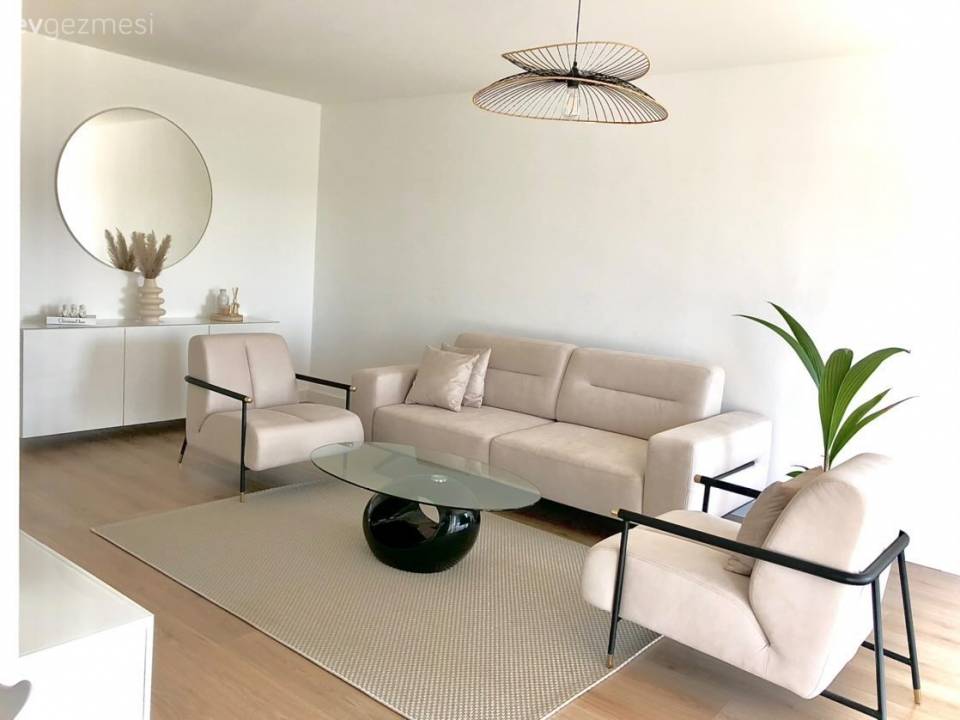 Salon, Modern, Beyaz, Gri, Tv ünitesi, Tv ünitesi aksesuarları, Ev Aksesuar, Ev bitkisi, Koltuk takımı, Bej, Halı, Salon halısı, Orta sehpa, Sehpa, Lambader, Aydınlatma