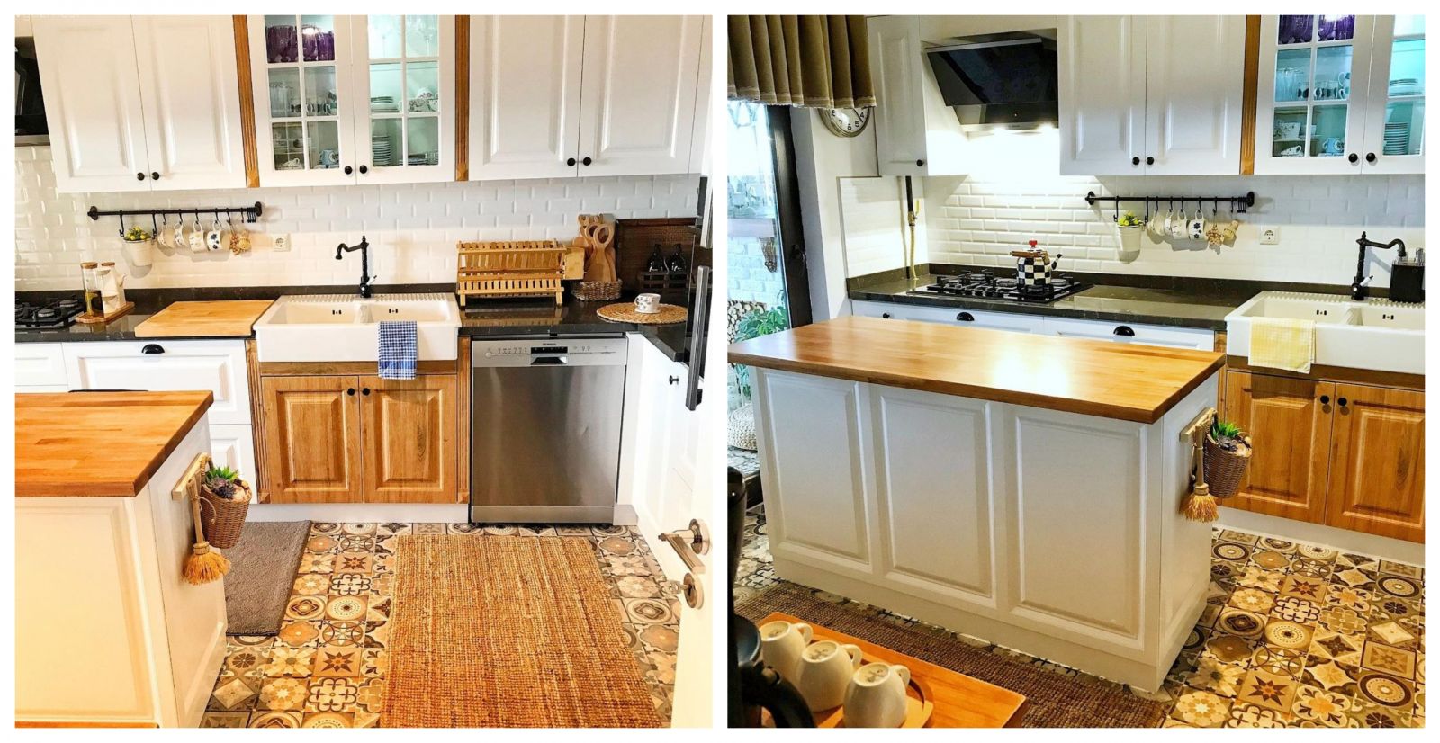 Rustik mutfak, Mutfak, Beyaz, Beyaz ve ahşap mutfak, Mutfak halısı, Ada mutfak, Mutfak tezgahı, Mutfak tezgah arası, Metro seramik, Seramik, Shaker kapaklı dolaplar, Jüt halı, Halı, Mutfak zemin seramikleri