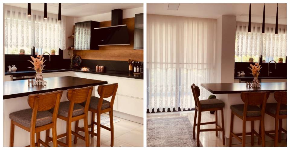 Beyaz ve ahşabın buluştuğu mutfakta, daha önceki ziyaretimizden farklı olan başlıca detay merkezdeki ada!