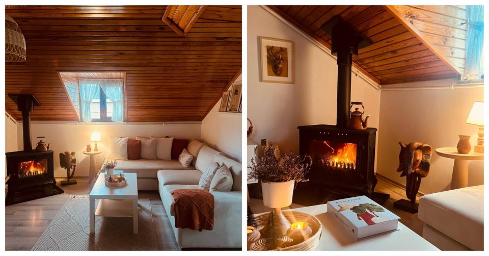 Taş duvarlara en çok ahşabın yakışacağını iyi bilen ev sahibimiz, ahşap bir pergola ile tavanı kaplamış. Boydan boya pencerelerle de aydınlık sağlanmış.