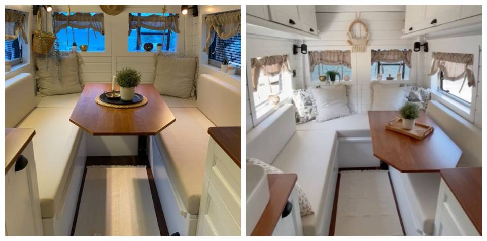 Oturma alanının biraz ötesinde oluşturan yemek bölümüne sıra geldiğinde modern stil yerini country tarza bırakmış.