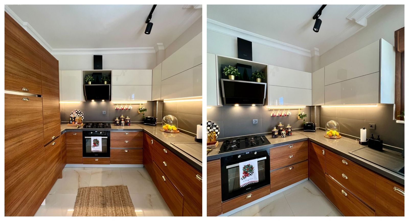 U tipi plana sahip olan mutfakta dolapların çoğunluğu ahşabı kuşanmış. Eee haliyle de doğallık almış başını gitmiş!
