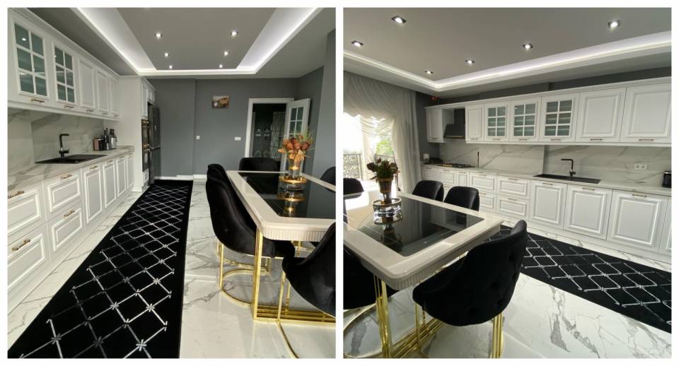 Mutfak, Beyaz, Siyah, Mutfak tezgahı, Mutfak tezgah arası, Tezgah arası seramik, Shaker kapaklı dolaplar, Mutfak zemin seramikleri, Ankastre