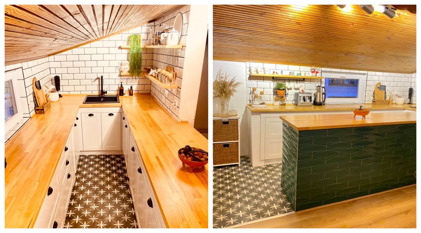 Dolapların kapakları beyaz ile ferahlatılmış. Tezgahta da ahşap kullanılınca sıcacık ambiyans oluşmuş.