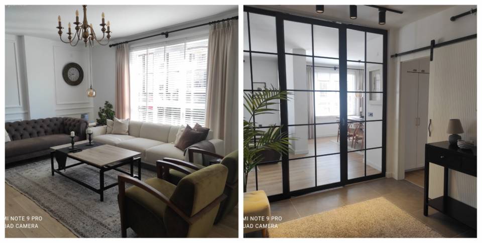 Salonun dekorasyonu yapılırken ilk olarak iç mekan detayları renklendirilmiş: Duvarların biri açık yeşil renge boyanarak ortamın enerjisi yükseltilmiş.