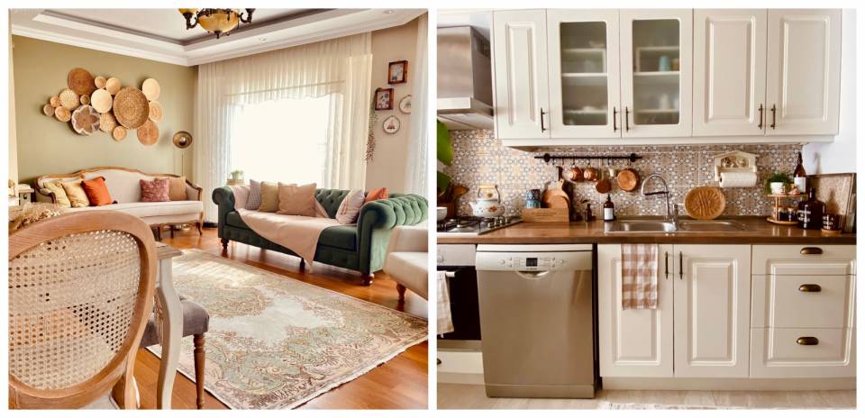 Halıdaki etnik desenler ve etraftan seslenen bitkiler de dekorda yerini alınca ev sahibimizin istediği seviyede bir dekor ortaya çıkmış.
