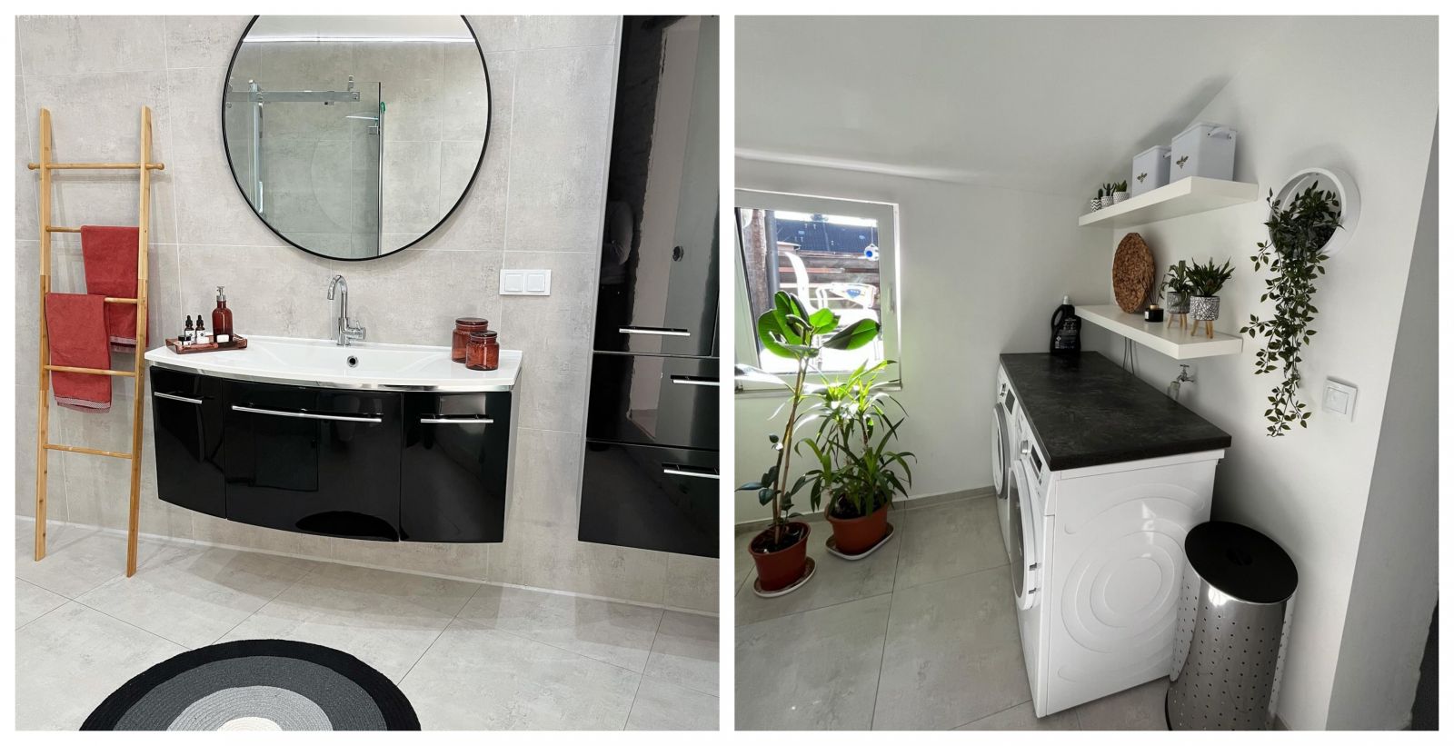 İki ayrı bölümden oluşan banyoda sürgü kapı sonrası çamaşır odası oluşturulmuş. Bu şekilde hem banyo hem de çamaşır odası yeni hale gelmiş.