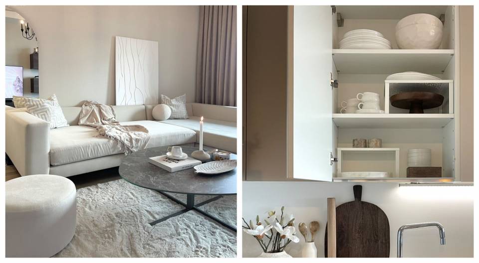 Genel olarak modern stilin hakim olduğu evde beyaz baskın şekilde kullanılmış. Ona eşlik eden nötr pigmentler de pirinç yansımalarla hareket kazanmış.