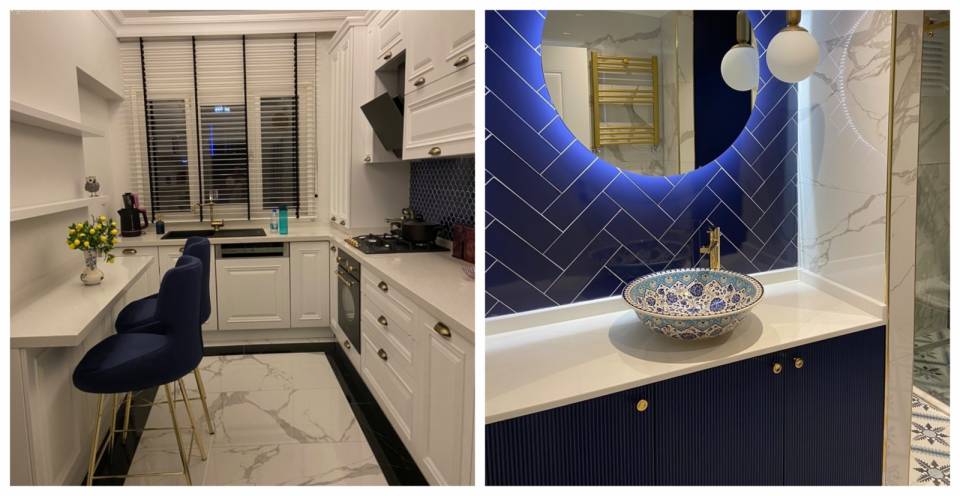 Evde kullanılan kubbemsi kapılar alanın romantik tavrını belli etmiş. Shaker kapaklı dolaplar da bunu devam ettirmiş.