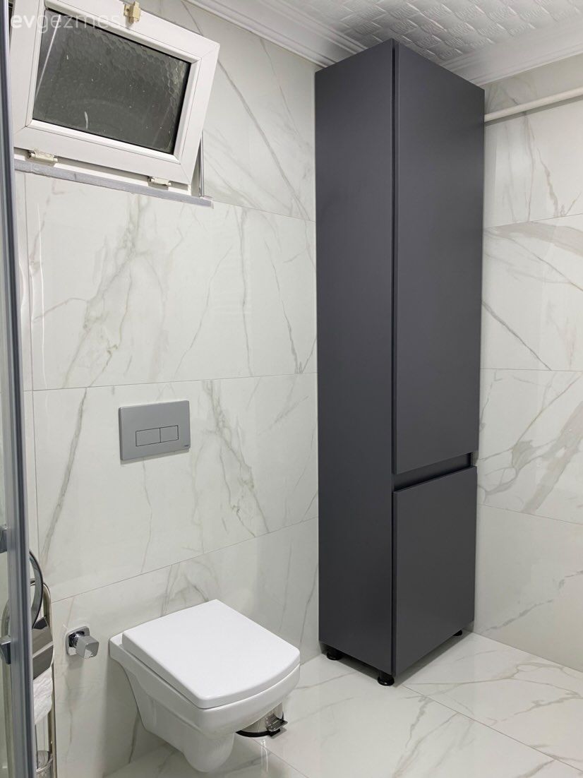 Her iki alanın yeni halinde de gri renk belirleyici olmuş: Mutfakta antrasit haliyle seslenmiş. Banyoda daha açık şekilde...