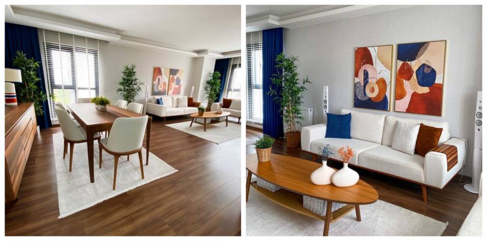 Salon, Beyaz, Mavi, Kahverengi, Koltuk takımı, Orta sehpa, Sehpa, Kırlent, Ev tekstili, Ev bitkisi, Dekoratif Objeler, Şamdan, Ev Aksesuar