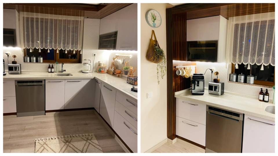 Salona göre daha koyu tonlarda kalan mutfakta antrasit renkli dolaplar kendini göstermiş. Ama beyazın dengesiyle birlikte burada da karamsarlıktan uzaklaşılmış.