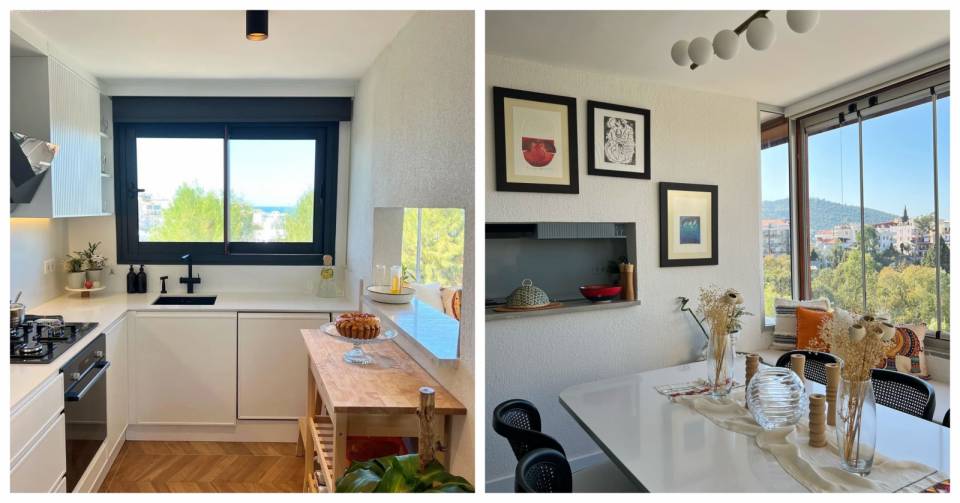 Mutfağın minimal ve modern tavrına biraz daha keyif katmak istemiş ev sahibimiz. Bu noktada da çerçevelerden ve hasır objelerden yararlanmış.