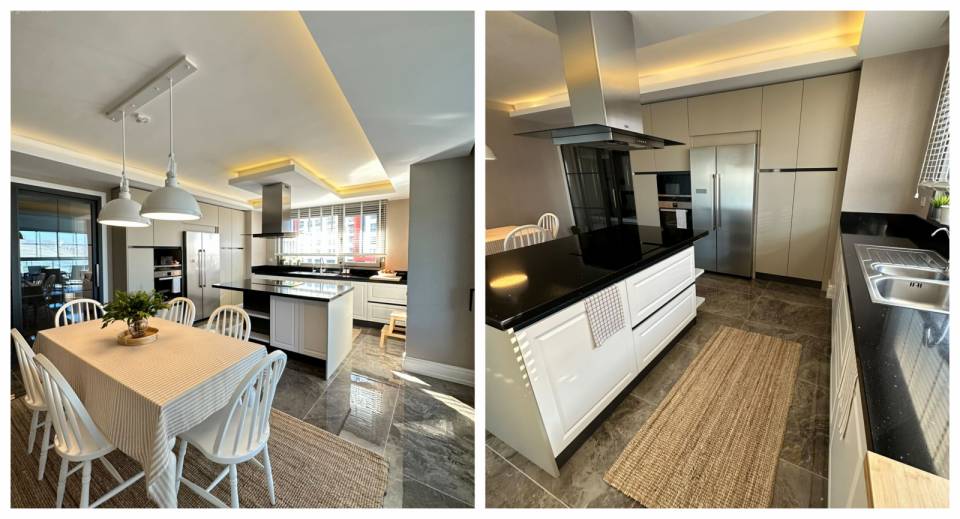 Mutfak, Beyaz, Ahşap Mobilya, Kırlent, Ev tekstili, Kulpsuz mutfak dolabı, Mutfak tezgahı, Mutfak tezgah arası, Tezgah arası doğal taş, Mutfak halısı, Geometrik desen, Desenler, Davlumbaz