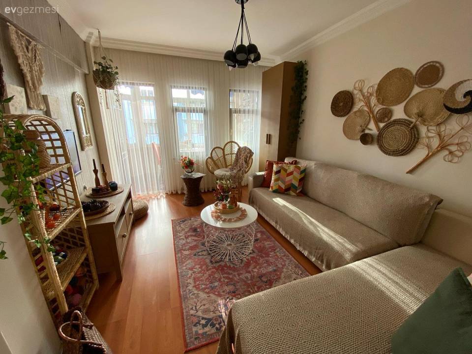 Tamamen açık tonların kullanıldığı salonda monotonluğun önüne hasır detaylarla geçilmeye çalışılmış. Sehpaların country görünümüyle de sıcaklık sağlanmış.