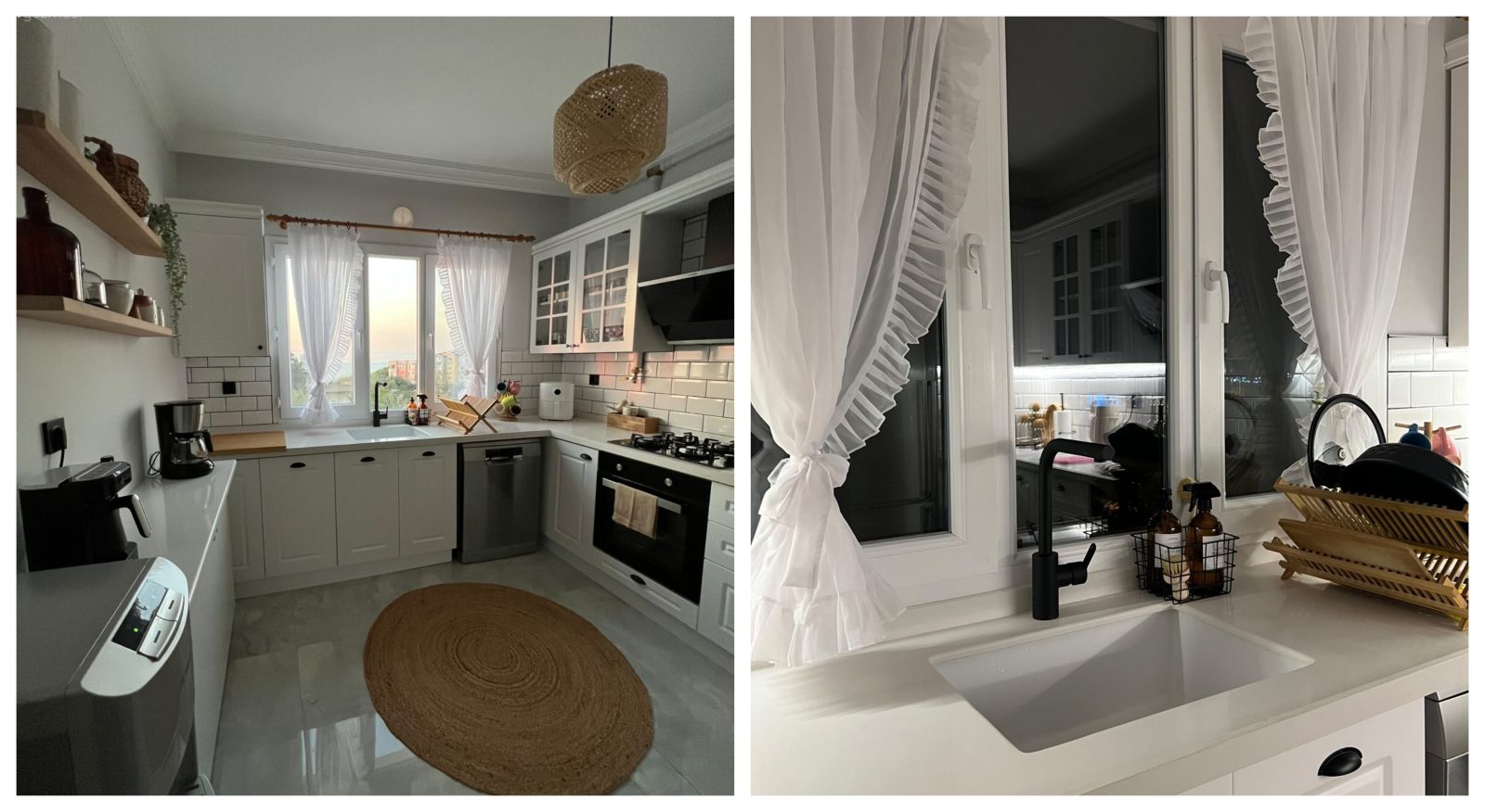 Mutfak, Beyaz, Rustik, Siyah, Mutfak tezgahı, Mutfak tezgah arası, Tezgah arası seramik, Mutfak rafı, Mutfak perdesi, Ankastre, Hasır avize, Jüt halı, Halı