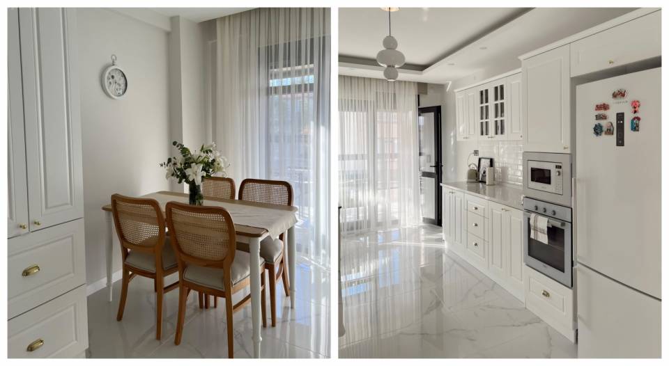 Mutfağın son dokunuşları için yerini alan fırfır perde romantik bir hava katmış. Hasır avize ve jüt halı da samimiyeti arttırmış.
