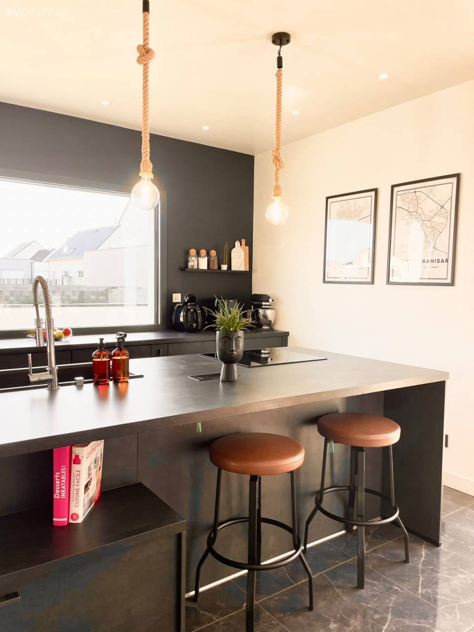 Beyazın yanına siyah kontrastların eklendiği mutfakta işlerin kolaylaşması adına farklı köşeler oluşturulmuş.