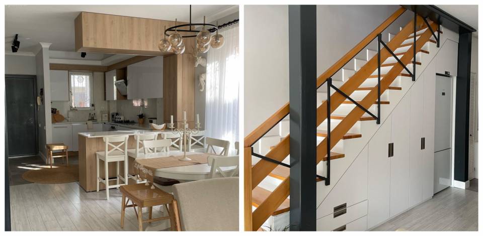 Bir duvarı tamamen kaplayacak şekilde yapılan bu dolaba, kahve köşesi için orta kısım ayrılmış. Kahve köşesinin arka fonunda kullanılan lambri çıtalar tasarımı zenginleştirmiş.