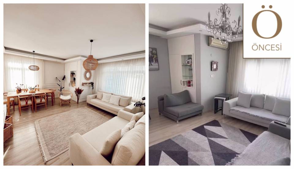 Tarz olarak modern ve klasik stilden ilham alan bu alanda dolaplar ve halı modern çizgide olmuş. Alçıpan tavan, perdeler, avize, masa ve sandalye gibi detaylar da klasik esintileri üzerinde taşımış.
